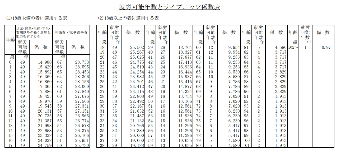 「ライプニッツ係数」については、決まった係数ですのでこれを変えることはできませんが、この係数は、年齢と就労可能年数のどちらかで計算されます。