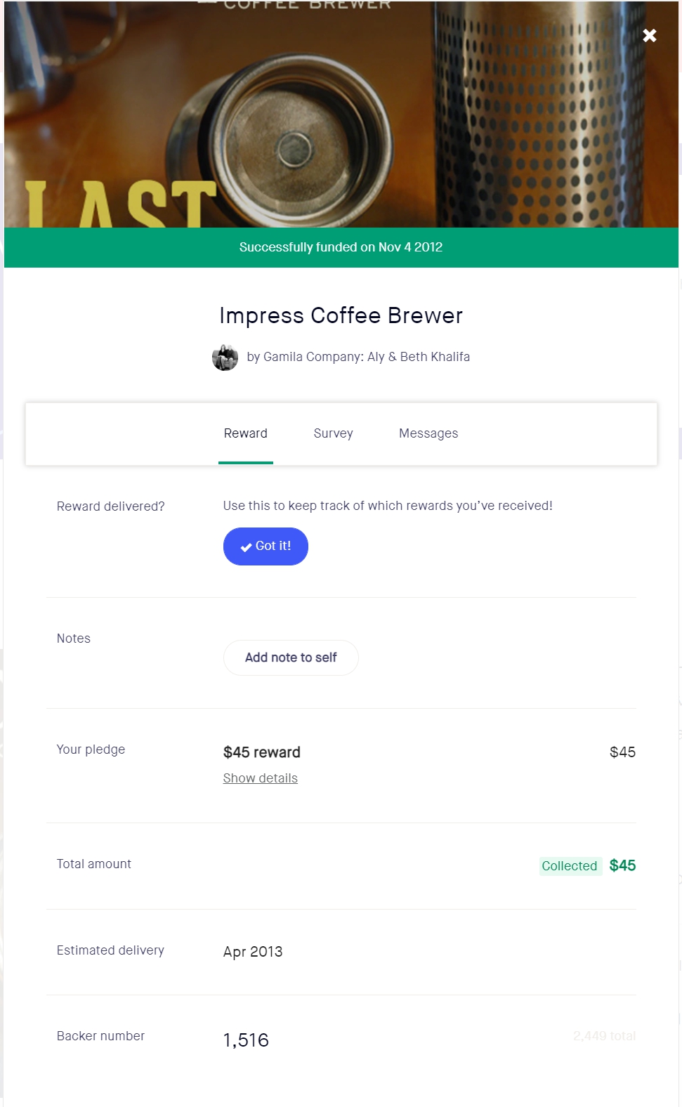 例えば、Kickstarterでプロジェクトに参加した「Impress Coffee Brewer」は、プロジェクトでの投資額は45米ドルでした。