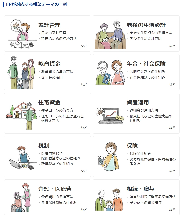 日本FP協会のサイト「ファイナンシャル・プランナー(FP)とは」では、FPが関わる場面として以下のような例を挙げています。